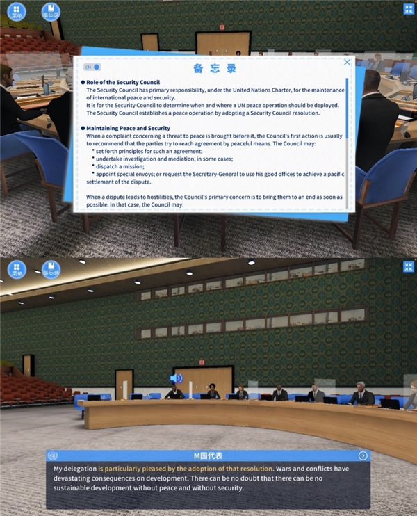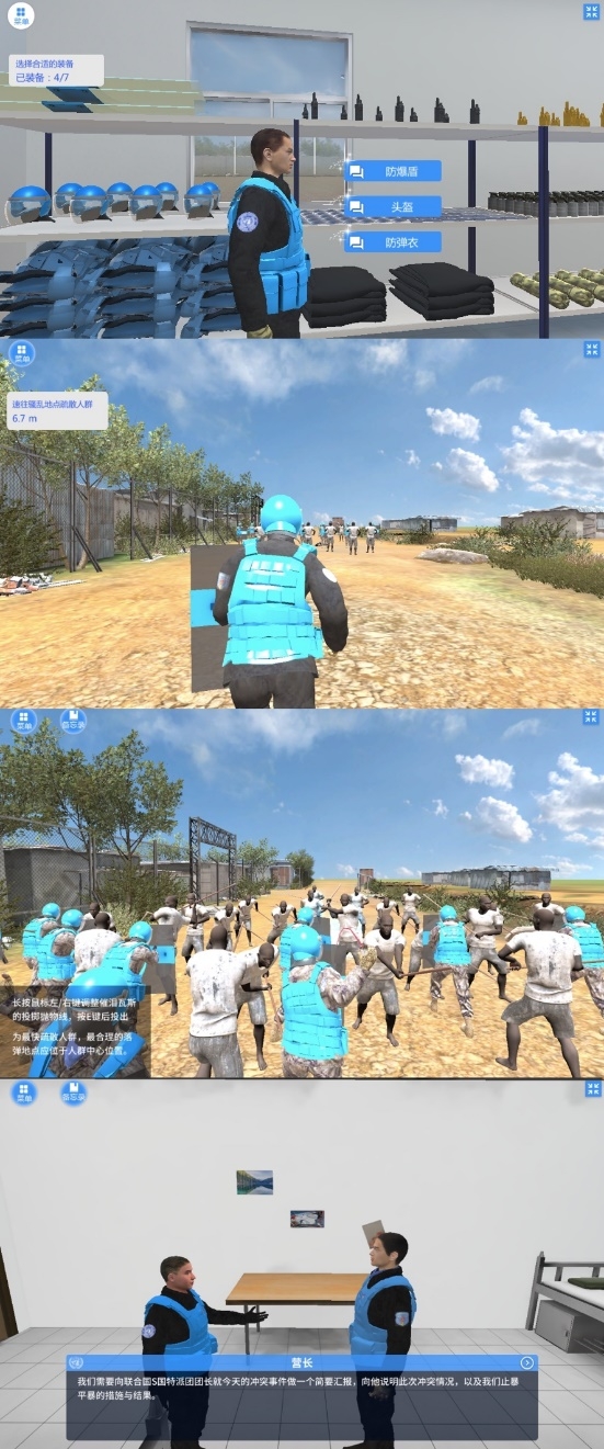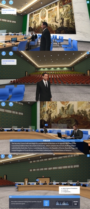 基于Unity3D引擎开发,依托智能语音评测引擎、翻译自动评阅引擎等现代技术融合独家专业性真实素材,搭建联合国安理会会议、难民营平暴、边境橘子林排爆、SOS国际儿童村探访等高度仿真的大型沉浸式虚拟场景,让学生身临其境参与国际组织工作,完成维和任务;同时,设置联合国安理会轮值主席、中国代表及其他国家代表、维和警察、工兵营营长、难民、当地居民、维和工兵、SOS儿童村村长、儿童等高度仿真虚拟角色,使学生通过不同角度展开辩证思考,锻炼其综合能力。