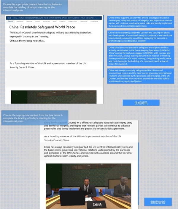 以虚拟仿真技术构建思政课堂,让学生通过亲身体验加深理解中国军队为世界和平与发展作出的重要贡献,加深理解中国军队为世界和平出征,源于中华民族的和平基因、中国人民的天下情怀、人民军队的根本宗旨以及中国的大国担当。如模块一通过设计学生作为中国常驻联合国代表“亲身参与”安理会表决与阐释性发言后,选择新闻素材发排联合国安理会新闻简报,体现中国对决议问题的立场,及中国维护世界和平与安全的一贯立场,从感性体验升华至理性阐述,向世界表述中国立场,中国贡献。