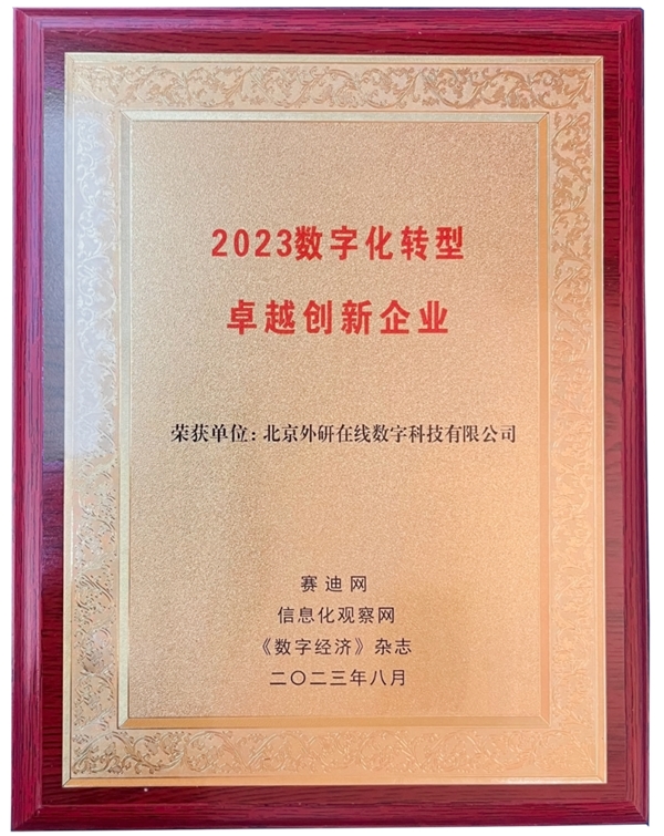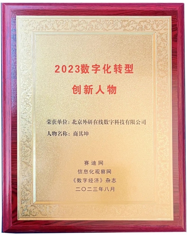 为助力数字经济的高质量发展,8月15日,2023数字化转型推进大会在北京成功举办。北京外研在线数字科技有限公司受邀参会并荣获“2023数字化转型卓越创新企业”,同时CEO商其坤先生荣获“2023数字化转型创新人物”。