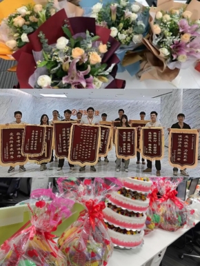 (简橙钱米课程学员们自发组织送来的锦旗以及鲜花蛋糕)
