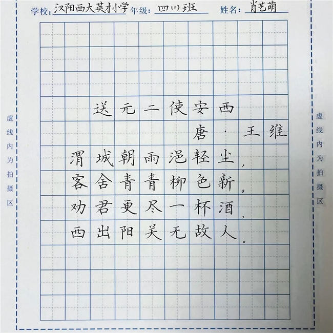 在众多优秀作品中,来自汉阳西大英小学四(1)班的肖艺萌同学的作品脱颖而出。她的作品《送元二使安西》笔锋流畅自然,字体清秀雅致。从她的字里行间,能感受到她对书法艺术的深刻理解和扎实的书写功底,仿佛能看到她在书桌前专注书写的模样,沉浸在书法的世界里,用笔墨诉说着对诗词的感悟。