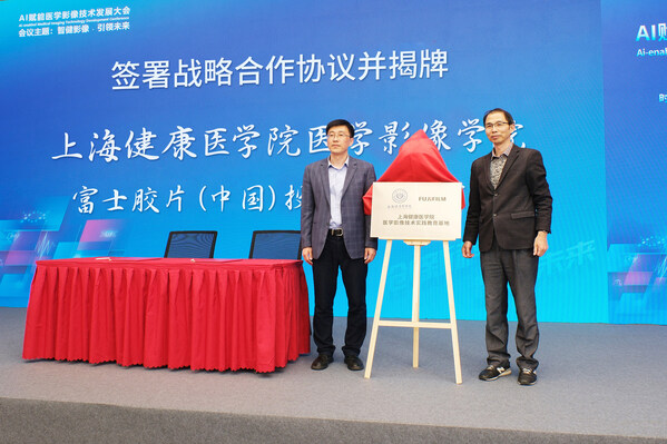 上海健康医学院医学影像学院李晓欧院长与富士胶片智慧医疗技术培训中心副所长陈杰共同为“上海健康医学院医学影像技术实践基地”揭牌