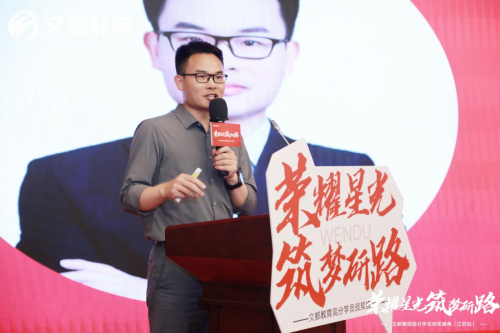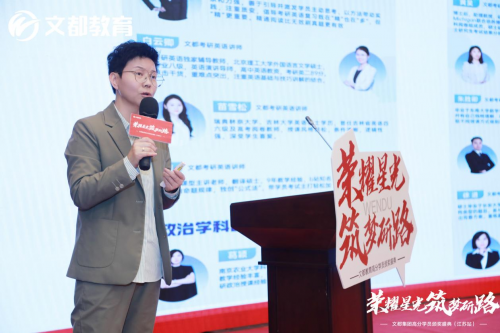活动在文都集团江苏省校长吴金波老师的致辞中拉开帷幕。他回顾了文都教育29年来在考研领域的深耕历程,强调文都始终以“强大师资、科学教研、全程服务”为核心竞争力,累计助力超千万学员实现升学理想。吴金波老师表示:“考研不仅是一场知识的较量,更是方法与坚持的考验。祝贺高分学子成功上岸,也期待更多同学在文都的陪伴下‘一战成硕’!”其铿锵有力的发言点燃全场热情,掌声经久不息。