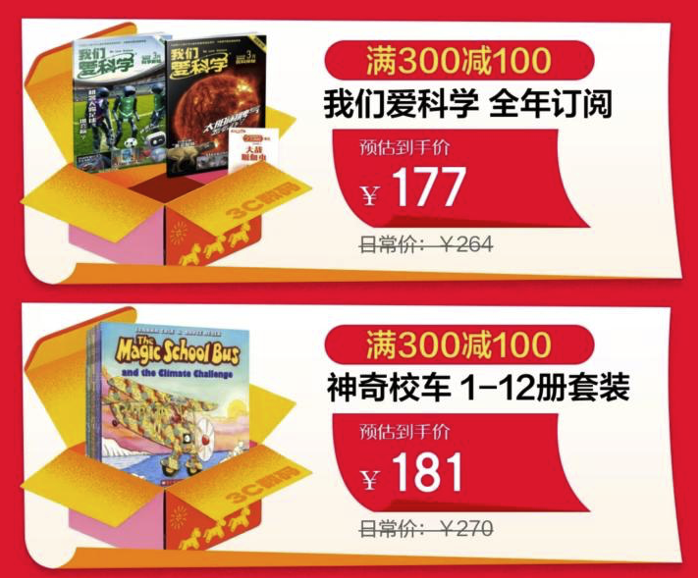趣味科普类读物是少儿科学启蒙的优质选择,两款经典科普读物均享满300减100福利。国家级少儿科普期刊《我们爱科学》以生动的图文和浅显的语言解读科学知识,激发孩子的科学探索兴趣,是几代少年儿童的科普阅读首选,全年订阅预估到手价177元。全球销量极高的儿童科普图画书《神奇校车》1-12册套装,以趣味故事为载体传递专业科学知识,让孩子在沉浸式阅读中解锁科学奥秘,满减后预估到手价181元。
