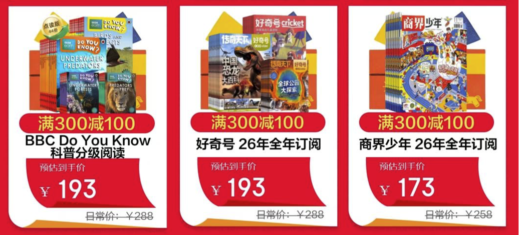 丰富的通识成长类读物能为孩子搭建起多元的知识体系,三款读物覆盖英文科普、全学科通识、少儿财经成长三大方向,同样可享满300减100优惠。BBC《Do You Know》科普分级阅读,对标剑桥小学科学绘本读物,融合英语学习和科学启蒙资源,帮助孩子在获取知识的同时自然习得语言,预估到手价193元。少儿科普畅销期刊《好奇号》,内容覆盖十大学科,搭配通识阅读内容与中英双语册,全方位拓宽孩子的知识边界,2026年全年订阅预估到手价193元。专注于财经素养和成长教育的《商界少年》,从生活现象出发讲解财经知识,引导孩子理解商业社会,培养财商思维,2026年全年订阅预估到手价173元。
