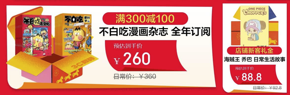 除了干货满满的知识类读物,轻松有趣的漫画类读物也为新春阅读增添了别样乐趣。《不白吃漫画杂志》以漫画形式解读各类趣味知识,让阅读和学习变得轻松有趣,全年订阅享满300减100优惠,预估到手价260元。漫画《海贼王 乔巴 日常生活故事》作为风靡全球的《海贼王》系列衍生作品,打造温馨有趣的日常生活片段,为读者带来轻松愉悦的阅读体验,活动期间可享店铺新客礼金,预估到手价88.8元。